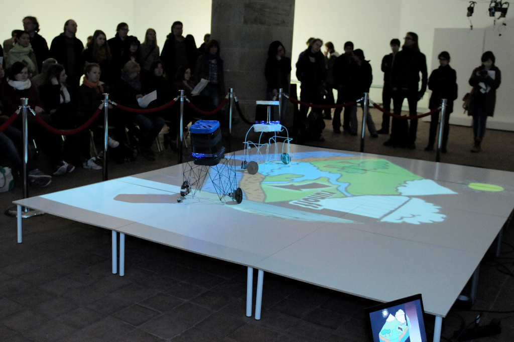 The basic attribute of Robotanica approach is “the view from below”, meaning that the devices themselves are the main actuators (actors) of the situation, which encompasses move, light and sound. This views are multiplied by the projections to the four corners of the world/ walls – creating predominantly a space of devices – a kind of contemporary Garden of Eden where a Human might only be a visitor – an object in the projection. Not a catastrophic image of modern world – on the contrary!