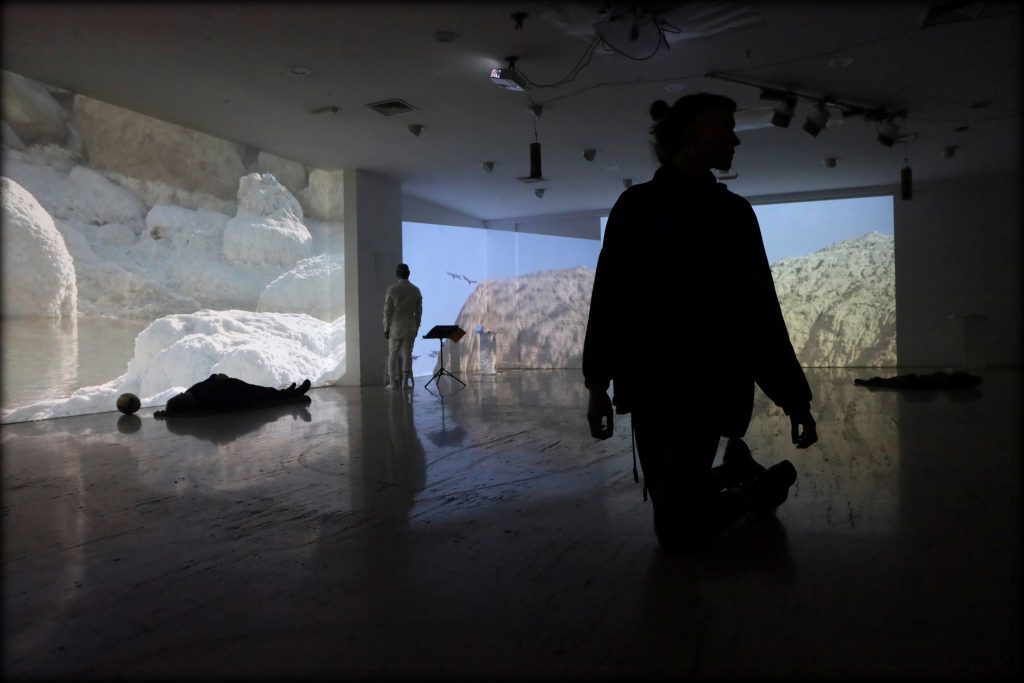 Ram Ram performance plays with movements of minimalism and readymades of reality that are more artificial than art. A cinematic series of philosophical paradoxes on a construction stage full of starry glimpses with a live concert saying the unspeakable about you. Ram Ram empties space and time and sweeps away the clutter of days gone by from your mind’s memory. An intimate performance with shadows and humour creates among high voltage energies. The meanders make the river slow to navigate. The desert is a place where the bush can speak. Ram Ram is the mosaic of living compost, delivering vitamins and minerals to the fire that consumes what we think we are.