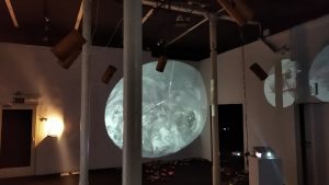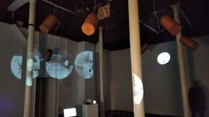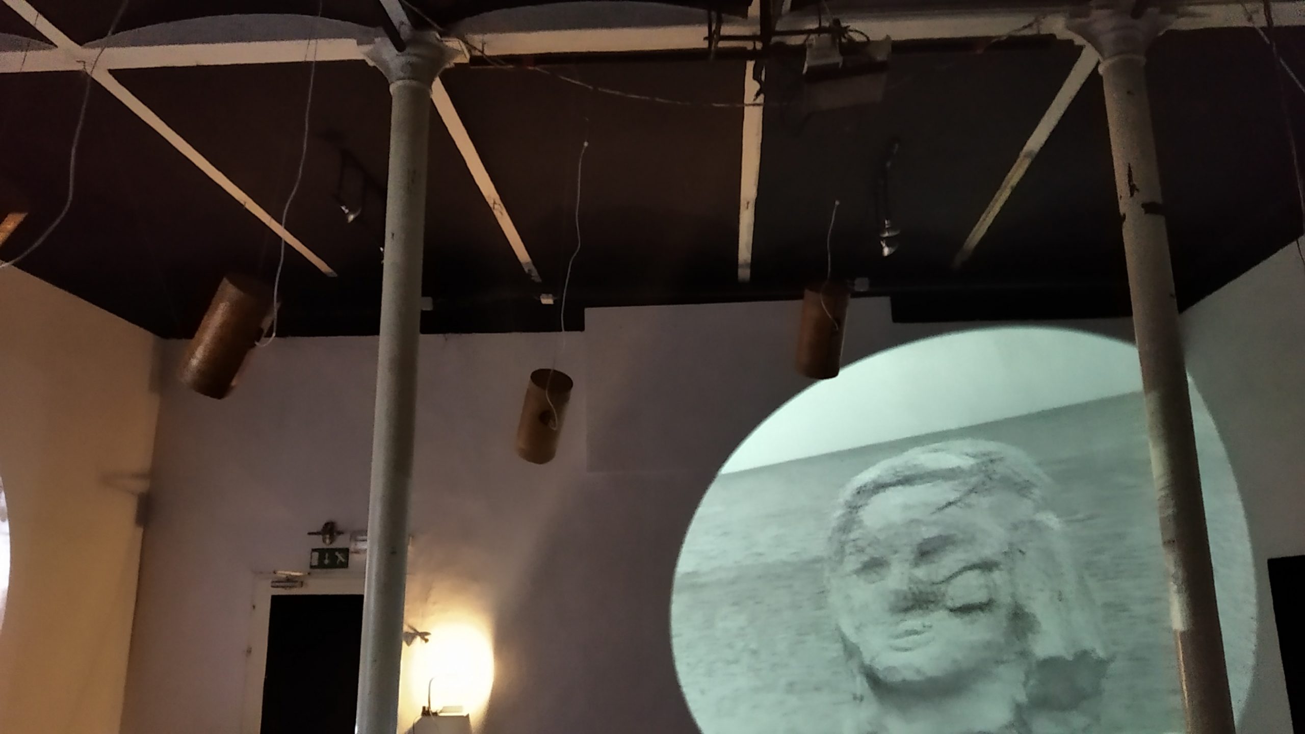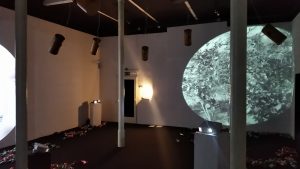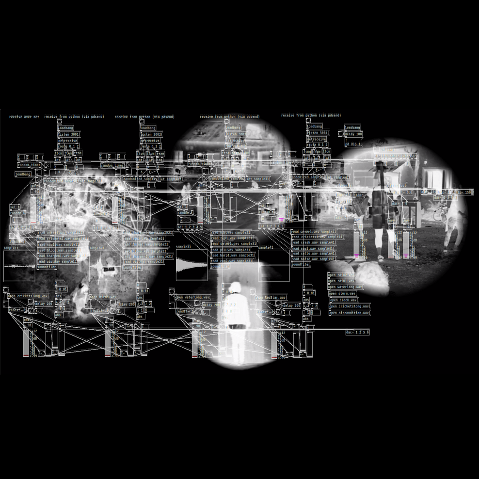 Borut Savski: The sound image is based on sound agents that evoke destabilizing effects: fragmentation of the sound image and undefinedness, simultaneity/parallelism of larger sound streams. All this scattered around the room in the manner of six sound sources. No focus. Unclear voices, conversations, sound like tinnitus, vague musical echoes. Uneven ripple. The sound dynamics are driven by changes in the video image of the played silent videos, the camera that detects the visitor, and the internal inertia of the computer algorithm. A moment of silence would probably be appropriate. The six suspended sound sources are not speakers, but rather light vibrating sound bodies distributed around the room. Their task is to fill/ empty the sound space, which is nevertheless primarily defined by video images. Even the synchronicity between picture and sound is not intended to be clear – but rather subtle.