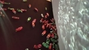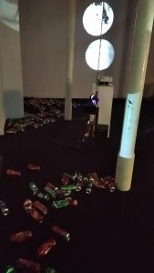 After the Party exhibition is designed specifically for the Alkatraz Gallery and its Metelkova concept. The latter is conveyed by an installation of beer cans that tells a story about consumption and the politics of recycling, but also touches on the remains of the party, a fragmented concert of smell and sound, images and feelings related to the way home or the morning after the party, which are treated literally and metaphorically in sound and pictures.
