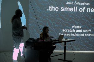 Coming from vastly different expressive traditions, languages and their underlying cultures, they really shouldn’t have met. But they did. In Ljubljana. Specifically, somewhere more on the fringes of established practices that run in this city in a state and municipally funded environment. Each of them established in their own fields, they made a commitment to be an artistic band and enter the common unknown. It roars and whispers, visualizes absences and speaks – or at least writes. It might also do a little programming.